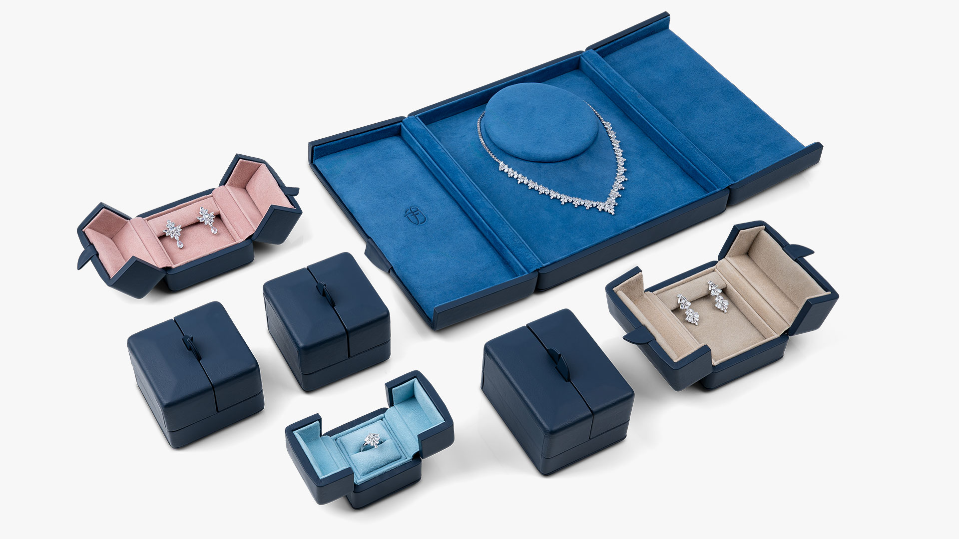 Die Etuiserie Versailles entfaltet ihre Vielfalt in sieben exklusiven Formen – geschaffen, um Colliers, Ringe, Ohrringe und Anhänger stilvoll zu bewahren. Jedes Etui wird von zarten Pastellnuancen edel gefärbten Kalbsleders vollendet, deren Eleganz sich harmonisch in jede Präsentation fügt. So verbinden sich Individualität und Raffinesse zu einer Bühne, die Schmuckstücke auf unvergleichliche Weise erstrahlen lässt.