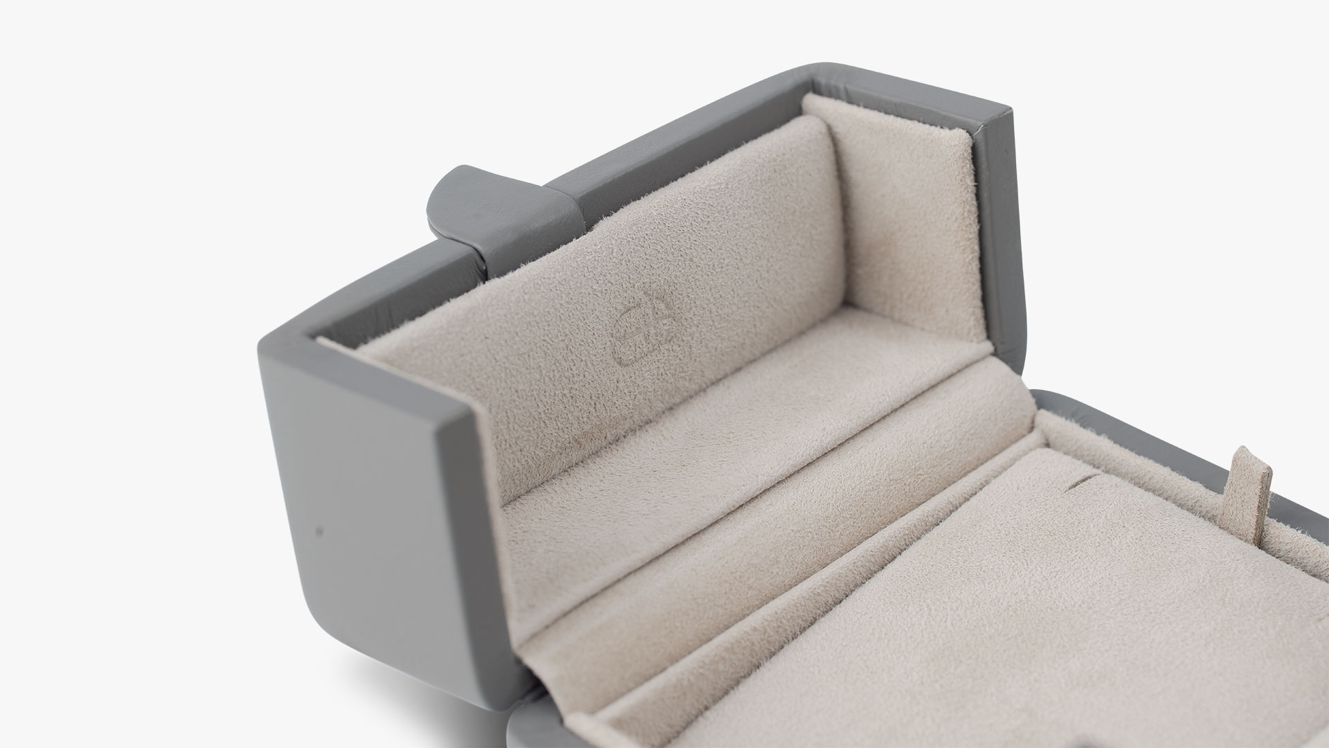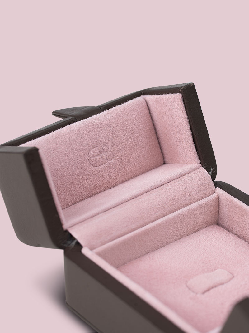 Jedes unserer Stücke wird mit feinstem Kalbsleder in sorgfältiger Handarbeit auf einen stabilen Holzkern aufgebracht. Dieser sorgt neben unserer ikonischen Form für außergewöhnliche Langlebigkeit und maximalen Schutz. Der unsichtbare Magnetverschluss fügt sich nahtlos ins Design ein und garantiert zugleich sicheren Halt. Im Inneren präsentieren perfekt geformte Einlagen in samtig-bezogenem Wildleder Ihre wertvollsten Juwelen mit sanfter Eleganz.