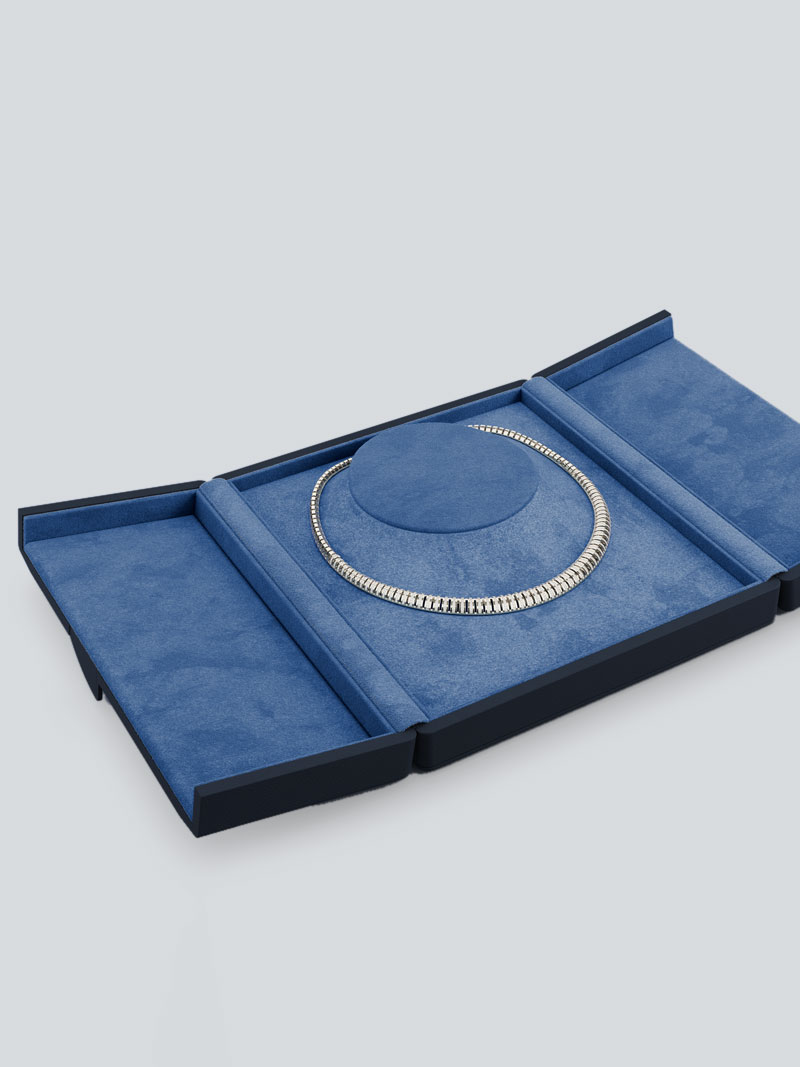 Nos luxueux emballages pour bijoux augmentent la valeur perçue de chaque bijou et créent un moment inoubliable lors de l'ouverture grâce à l'ouverture centrale en forme d'autel avec des fermetures magnétiques cachées. Les deux moitiés du couvercle s'ouvrent facilement grâce à des poignées semi-circulaires et se referment en toute sécurité. Ainsi, chaque présentation devient un point culminant émotionnel qui enthousiasme et fait vendre.